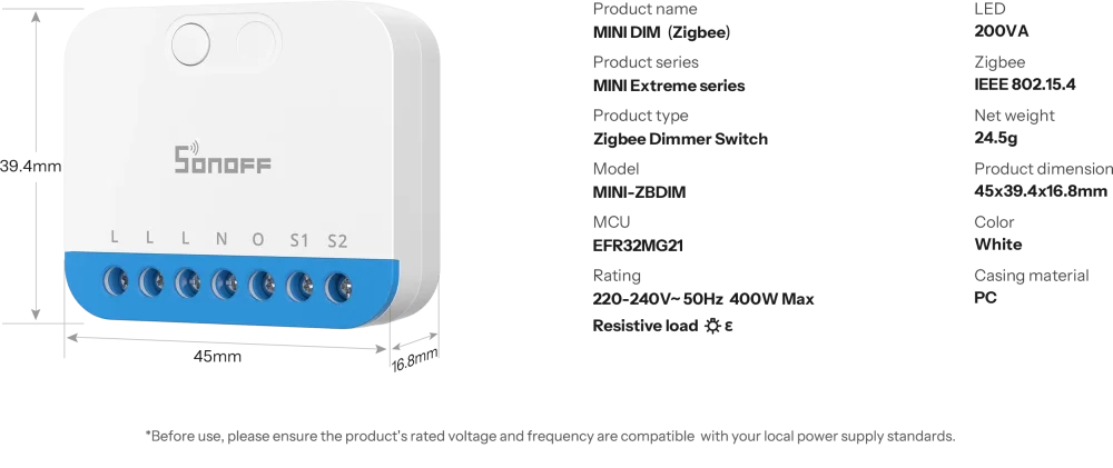 SONOFF MINI-ZBDIM je ultrakompaktní podomítkový stmívač Zigbee 3.0 se stmíváním typu trailing-edge, který umožňuje snadno a čistě přeměnit stávající světelné okruhy na chytré. Nabízí plynulé stmívání bez blikání s přesným procentuálním nastavením jasu a jemnými přechody. Zároveň funguje jako Zigbee router, čímž posiluje mesh síť a zvyšuje její dosah i stabilitu.